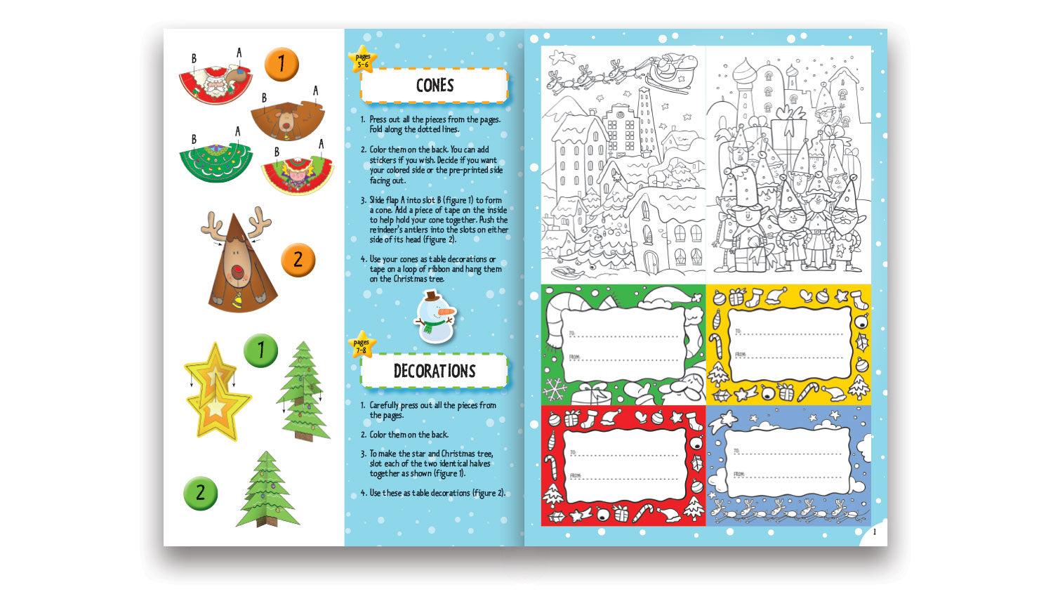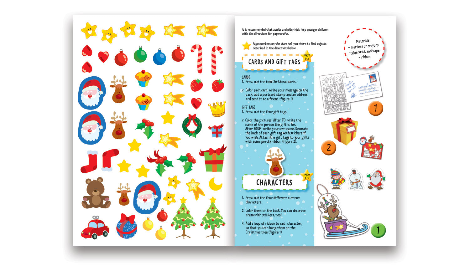 Fun Christmas papercraft activities for all kids, ages 4-100! Create a family tradition with this festive book of 12 pre-cut, pop-out, holiday ornaments, decorations, and greetings. Customize your origami creations with 100 + Stickers. Punch-out, Fold, Color and Play with easy to assemble, heavy duty card stock. No cutting tools required.