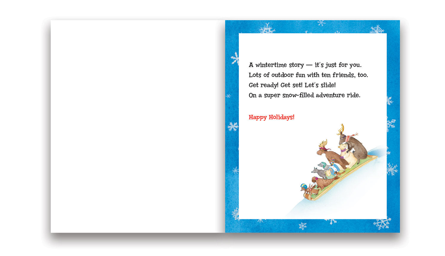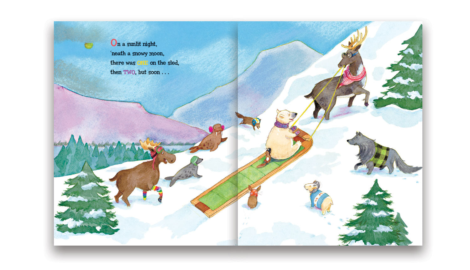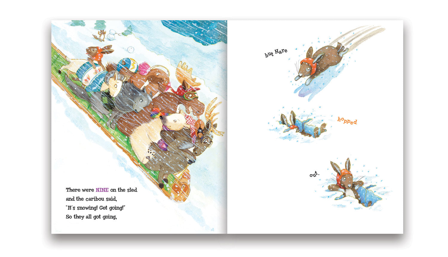 Get ready! Get set! Let’s slide! Enjoy a wintertime story about outdoor fun with ten silly friends on a snow-filled adventure. The joys of a wintertime sled ride are perfectly captured with Caribou at the reins! But the sled goes faster and faster and Seal, Hare, Walrus, and others have to hold on, or they’ll fall off! Oops! Seal slips out, and Hare follows soon. Will the others be able to hang on?